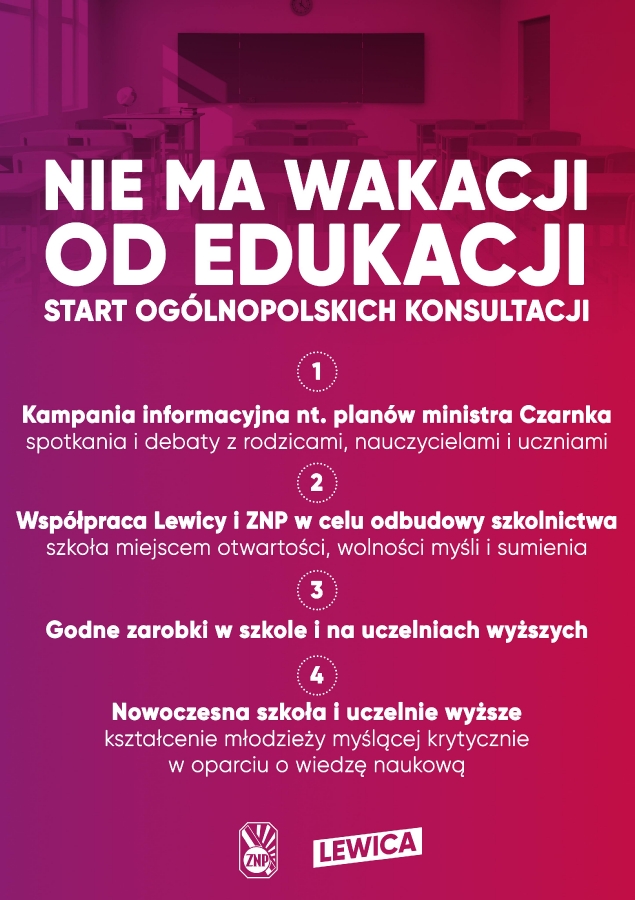 Lewica i Związek Nauczycielstwa Polskiego rozpoczynają od lipca ogólnopolską kampanię konsultacyjną pod nazwą "Nie ma wakacji od edukacji". To odpowiedź polityczek i polityków Lewicy oraz środowisk edukacyjnych na destrukcyjne planu ministra edukacji Przemysława Czarnka, który chce całkowicie podporządkować szkolnictwo partii rządzącej.